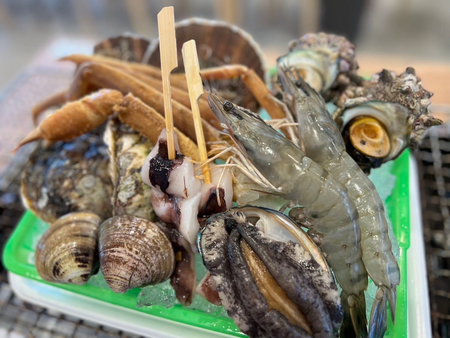 ホタテ×2 サザエ×2 岩ガキ×2 ハマグリ×2 エビ×2 イカ串×2 アワビ×1 カニ1肩(カニの種類は写真と変更になる場合あり)